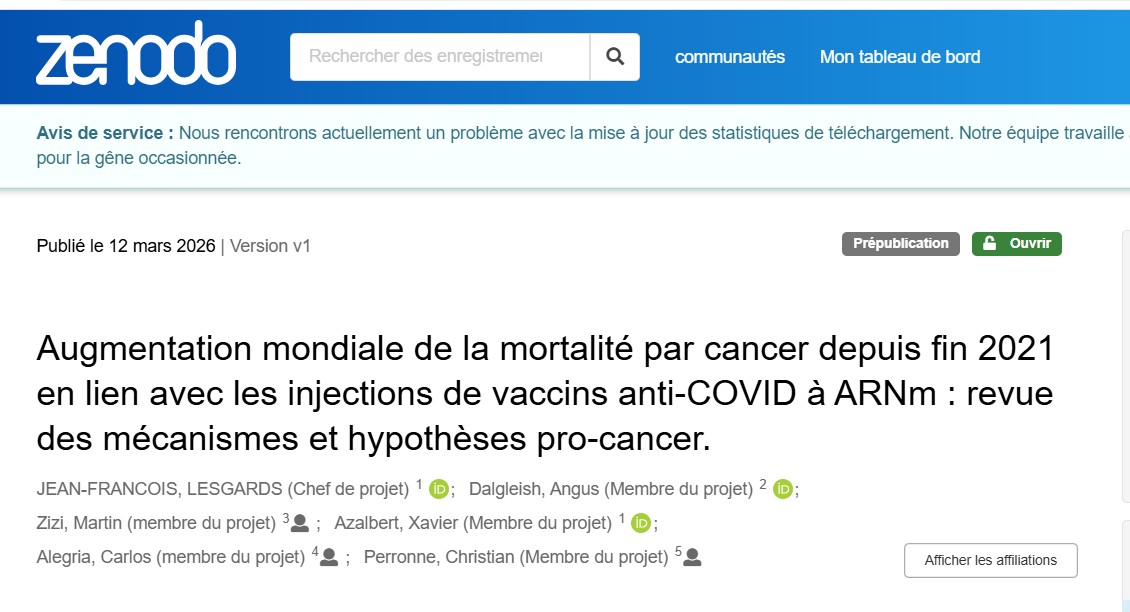 Nous présentons ici l’incidence des nouveaux cancers au cours des dernières années, qui montre une augmentation significative récente, notamment depuis fin 2021 aux États-Unis. L’incidence du cancer est connue pour être liée à divers facteurs, dont le tabagisme, les déséquilibres alimentaires et la pollution. Nous analysons ici l’impact potentiel des vaccins contre la COVID-19, en particulier des vaccins à ARNm, sur l’augmentation mondiale des cas de cancer.