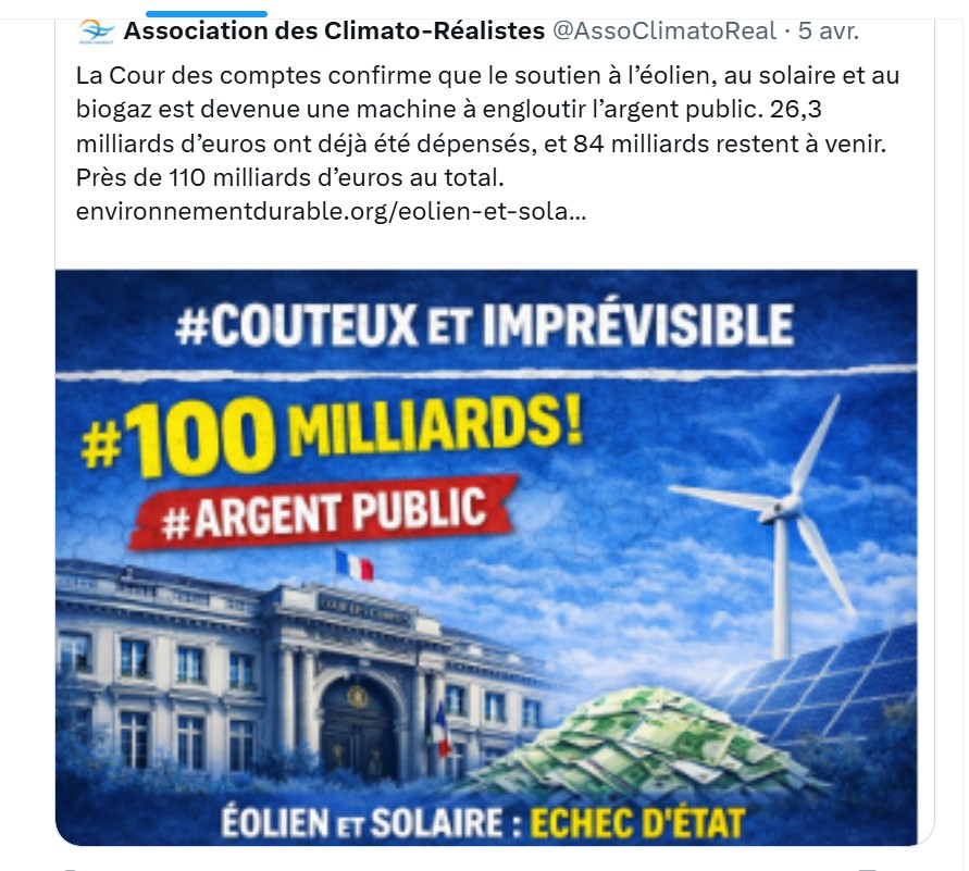La Cour des comptes vient de confirmer ce que beaucoup dénonçaient depuis des années : la politique de soutien à l’éolien, au solaire et au biogaz est devenue une machine à engloutir l’argent public. 26,3 milliards d’euros ont déjà été dépensés, et 84 milliards restent à venir. Près de 110 milliards d’euros au total. Et pourtant, rien ne change. A titre de comparaison « 110 milliards d’euros, c’est plus qu’une année entière du budget de l’Éducation nationale. »