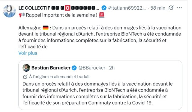Dans ce procès intenté par une femme qui attribue de graves problèmes de santé (maladie auto-immune, troubles circulatoires, syndrome de fatigue chronique, POTS, etc.) à deux injections de Comirnaty (BioNTech/Pfizer) en 2021, le tribunal a condamné BioNTech Manufacturing GmbH à fournir des informations complètes sur :la fabrication du vaccin (y compris les processus « Process 1 » et « Process 2 », les contaminations potentielles par ADN, etc.) ; la sécurité et les effets secondaires connus (y compris les cas suspects pharmacovigilance) ; l’efficacité et le rapport bénéfice/risque, notamment pour les symptômes de la plaignante.