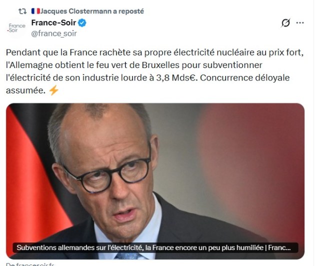 C’est un classique de la tension franco-allemande dans l’UE : Berlin obtient souvent plus de flexibilité sur les aides d’État quand il s’agit de préserver son tissu industriel (on l’a vu avec les subventions massives pendant la crise énergétique 2022-2023, ou pour l’automobile et l’hydrogène). Bruxelles valide régulièrement ces mesures au nom de la compétitivité et de la « transition », tout en imposant des règles plus strictes aux autres quand il s’agit de concurrence pure.Réalité nuancéePas de complot anti-français systématique : la Commission applique un cadre (CISAF) qu’elle a elle-même adopté en 2025 pour répondre à la crise. L’Allemagne argumente que sans cela, ses usines risquent la délocalisation vers des pays à énergie moins chère et normes environnementales plus laxistes (États-Unis, Chine, etc.). La condition de réinvestissement dans la décarbonation rend l’aide compatible avec les objectifs climatiques de l’UE.