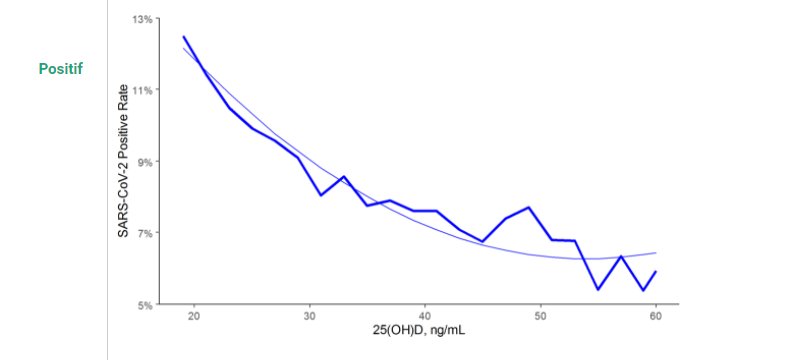 Une analyse de 191 779 patients aux États-Unis a révélé une positivité au COVID-19 fortement et inversement associée aux taux de 25 (OH) D circulants. La relation persiste à travers les latitudes, les races / ethnies, le sexe et les tranches d’âge. COVID-19 adjuste.