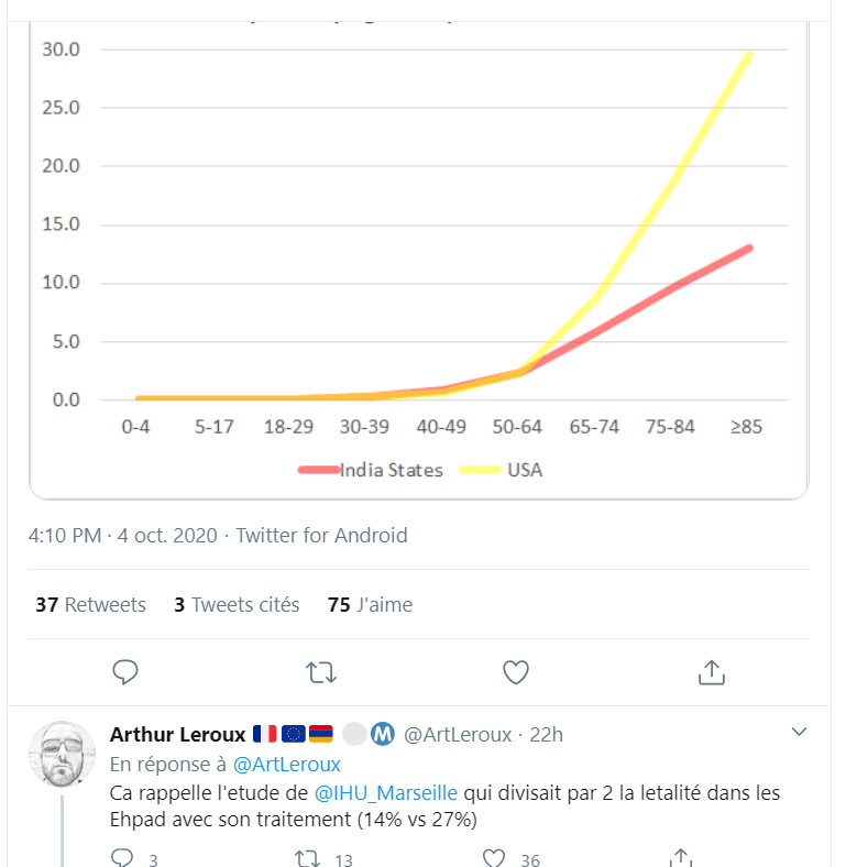 « Oui mais en Inde la population est plus jeune Comparaison de la létalité par classe d’âge entre deux états Indiens qui traitent précocement et systématiquement a l’#hydroxychloroquine et les USA où elle n’est utilisée que marginalement.