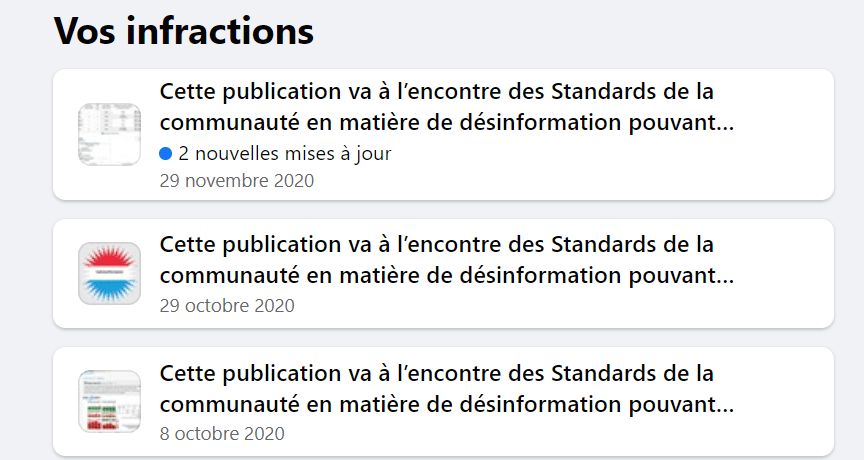 Heureusement les vérificateurs deLiberation , le Monde et Facebook sont là pour nous dire que ce que disent les scientifique met en danger la vie des citoyens puisque c’est en contradiction avec ce qu’il faut dire. J’ajoute donc l’avertissement ci dessus pour que vous puissiez diffuser.Personnellement je suis censuré. Vous constaterez que la cause en est bien la publication d’analyses scientifiques .