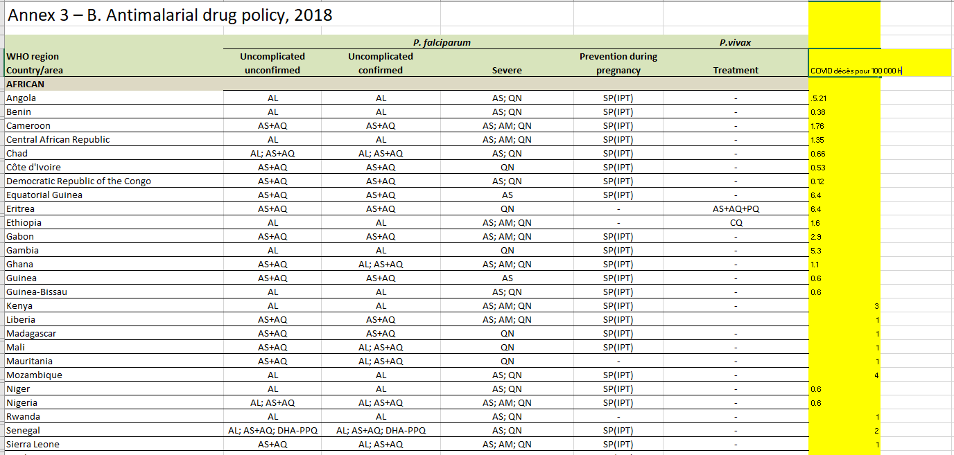 Aucun pays impaludé a plus de 5 décès covid pour 100 000 habitants en Afrique. En Amérique du sud le paludisme n’existe pratiquement pas ou plus du tout dans quelques pays… Le nombre de décès pour 100 000 habitants parle de lui même. Aucun ne préconise les antipaludéens contre la covid. Le record appartient au Mexique avec le même taux de décès que la France, 89 pour 100 000 habitants. La Colombie échappe majoritairement au palu mais pas à la covid (77 décès pour 100 000, idem pour le Pérou (114) Pas de palu mais du covid au Chili 84 décès pour 100 000 . Même refus des traitements du covid qu ‘en Europe