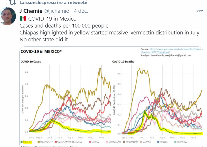 Al’intérieur du Mexique le contraste entre Mexico sans palu et sans chloroquine avec la région du Chiapas intrigue. Cette dernière semble immunisée contre le Covid; elle combine l’antipaludéen et l’ivermectine…