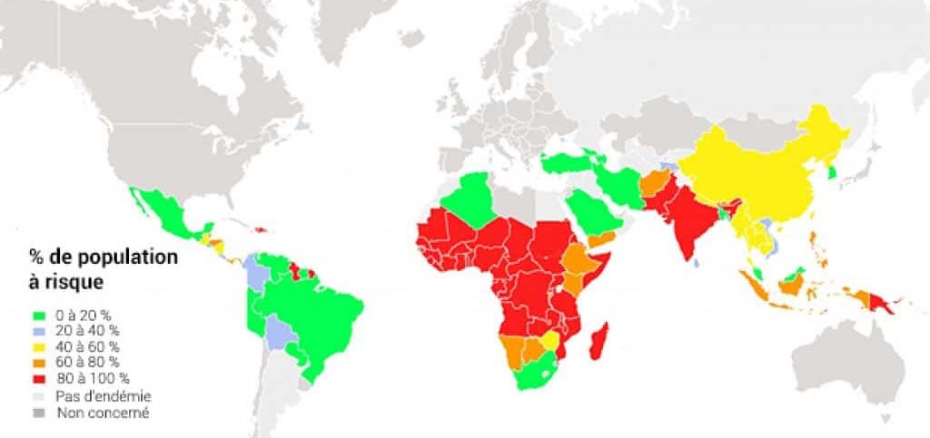 Endémicité très élevée en Asie du Sud, Afrique subsaharienne mais pas Afrique du Sud, Nord du Brésil Guyane fcse, amérique centrale et sud du Mexique