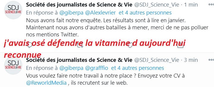 J’en ai pris plein la figure en défendant la vitamine D, surtout de la part des « journalistes sérieux » de Sciences et vie qui s’arrogent le monopole de l’info sérieuse « dans cette période où prospèrent les #fakenews et le complotisme médical, nous avons plus que jamais besoin d’un journalisme scientifique de qualité. Ce combat nous concerne tous » . Gag…