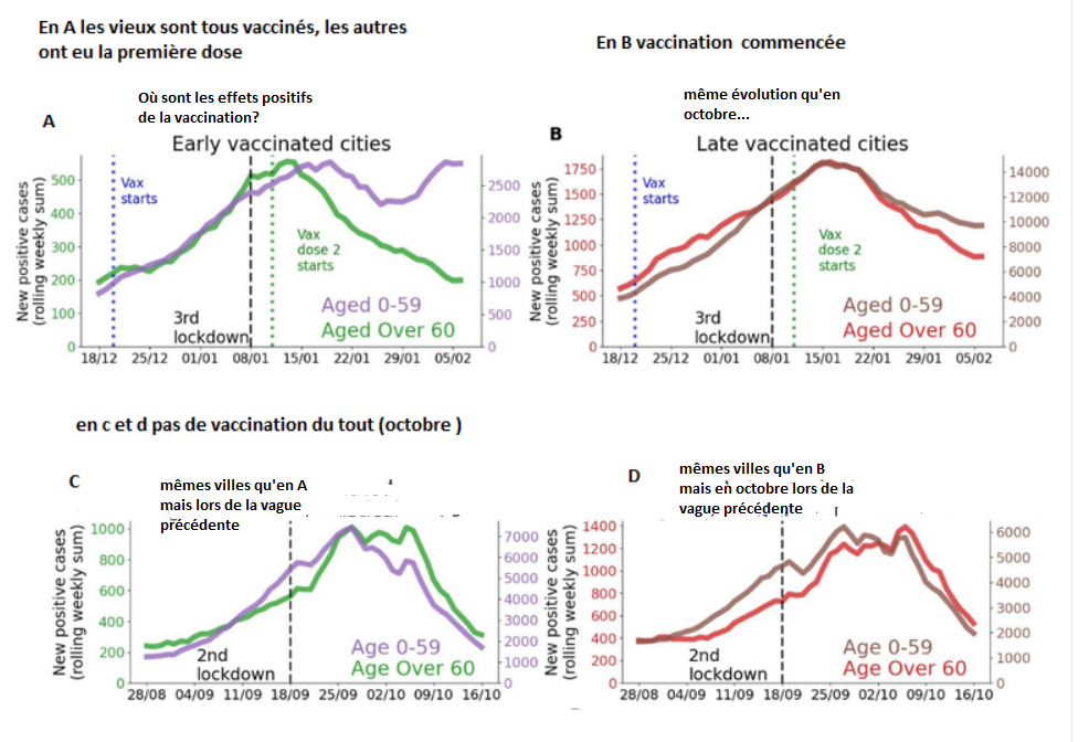 Comparons à ce qui s’est passé dans ces mêmes villes en octobre (fig A ci dessous); pas d’anomalie des cas positifs chez les vieux pendant la première période de l’épidémie, idem dans les villes où l’on à tardivement vacciné en janvier ou les mêmes en octobre.