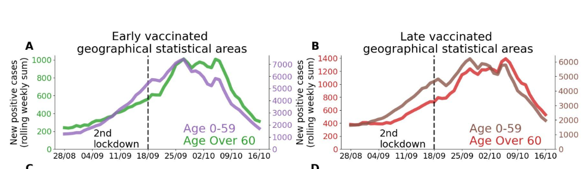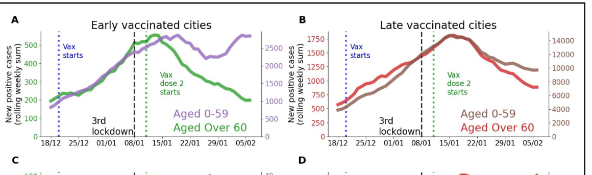 En A les villes dans lesquelles la vaccination est terminée (2 doses) pour les vieux et une dose pour les moins de 60ans. En C les mêmes villes en octobre sans la vaccination .