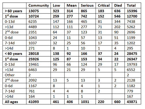 Outre les décès, on note 1031 cas graves et 220 cas critiques hospitalisés le 10 février ou à une date proche qui ont été vaccinés avec la première dose ou jusqu’à deux semaines après la deuxième dose.