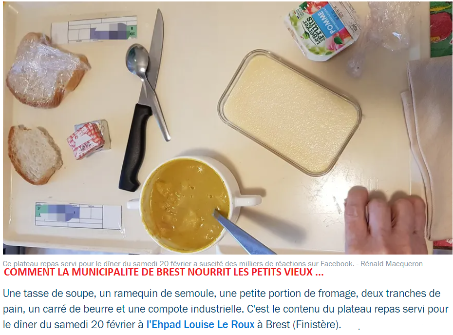 Pauvres vieux, triste monde , à Brest , le maire de Lyon a fait des émules , la municipalité ( socialo verte) affame non pas les enfants mais les résidents dans son ehpad …