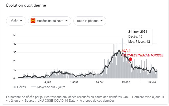 Je savais par contre que la Macédoine du nord avait ouvert la voie à l’ivermectine ,il semble que ça soit encourageant…maintenant certains pourront toujours dire que la mortalité baissait déjà avant la prise du médoc signe simplement d’un affaiblissement du virus,comme d’ailleurs un peu partout,mais mi décembre ça n’était qd même pas trop le cas