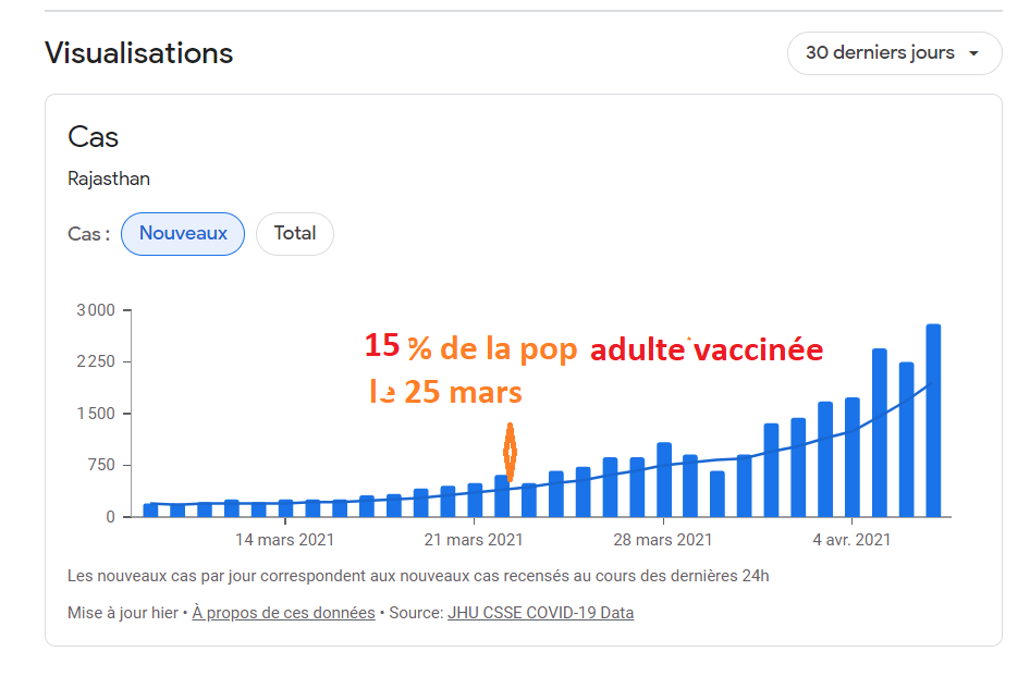 La vaccination remonte à quelques semaines, cet état de 68 millions d’habitants était le plus vacciné d’Inde il y a 15 jours avec 4,4 millions de personnes. Depuis le Majahrasta est devenu le premier pour la vaccination et.. la flambée de variants . Le Rajahstan compte aujourd’hui 18% de sa population adulte vaccinée