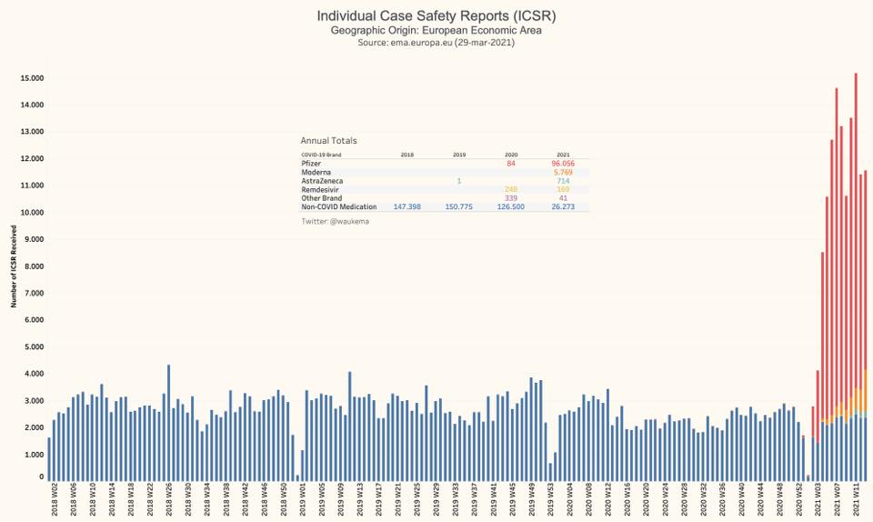 Le nombre de personnes souffrant de thrombocytopénie et de thrombocytopénie immunitaire après vaccination par Pfizer est actuellement de 517 et 225 respectivement. Il y a également 82 cas de coagulopathie et 52 cas de tendance accrue aux ecchymoses, et 43 cas de coagulation intravasculaire disséminée. Donc, les chiffres environ 10 fois pires que les médias traditionnels le suggèrent( bien que la plupart des médias parle seulement d astrazeneca et ignore totalement pfizer. )De plus, les effets de la coagulation sanguine ne se limitent pas à Atrazeneca, comme le suggèrent les principaux médias, mais sont plutôt communs à tous les vaccins. Cette stratégie médiatique suggère qu’Astrazeneca n’est qu’une distraction. Source:vigiaccess.org