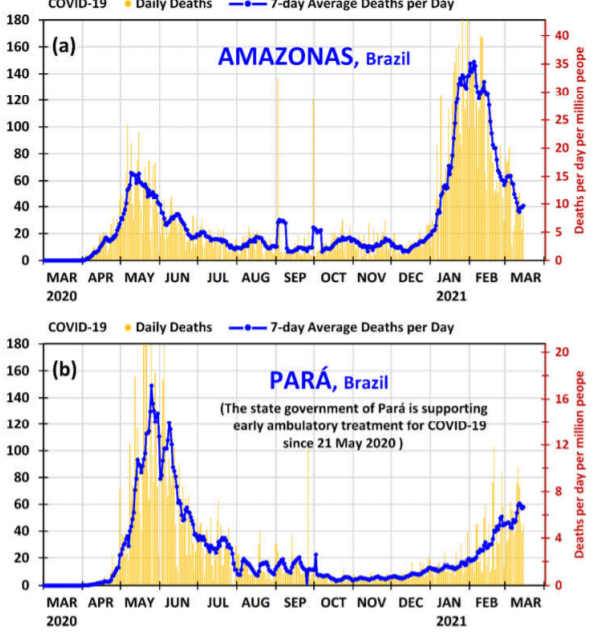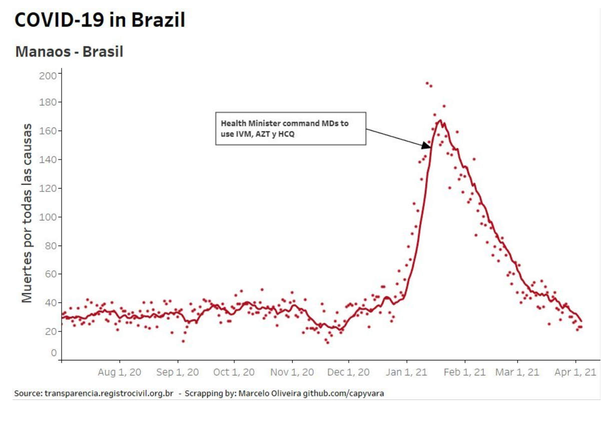 Il faut mentionner les villes au Brésil (environ 40 jusqu’à présent) qui ont décidé et mis en place le traitement précoce généralisé et ont réduit à quasiment zéro le nombre de morts dans ces villes.