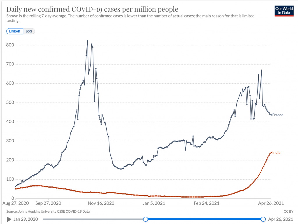 350 000 nouveau cas hier. Bigre. Et chez nous ? Depuis 1 mois, nous avons une moyenne de près de 35 000 cas / jour, plus de 20 000 / jour les 2 mois précédents, et un pic de 86 850 cas le 7 novembre 2020. France 67 millions d’habitants, Inde 1 375 millions, soit 20 fois plus. S’ils en sont à 350 000 cas / jour, à population égale, nous sommes à 700 000 cas /jour, soit 2 fois plus qu’eux. Pire, eux c’est un pic, un jour, nous c’est tous les jours depuis des mois, et nous aurions connu un pic à 1,74 millions le 7 novembre !