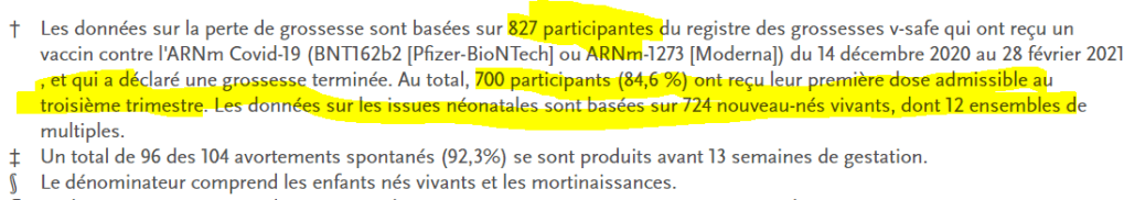 Les femmes enceintes avaient été écartées de la phase 3 des essais Pfizer mais un article rassurant du mois de mai indiquait que les avortements spontanés n’étaient pas plus fréquents que ce que l’on observe habituellement. Pensez donc sur 827 grosses terminées on ne comptait 12,5%¨d’avortement spontanés, alors que l’on peut s’attendre à 20% .