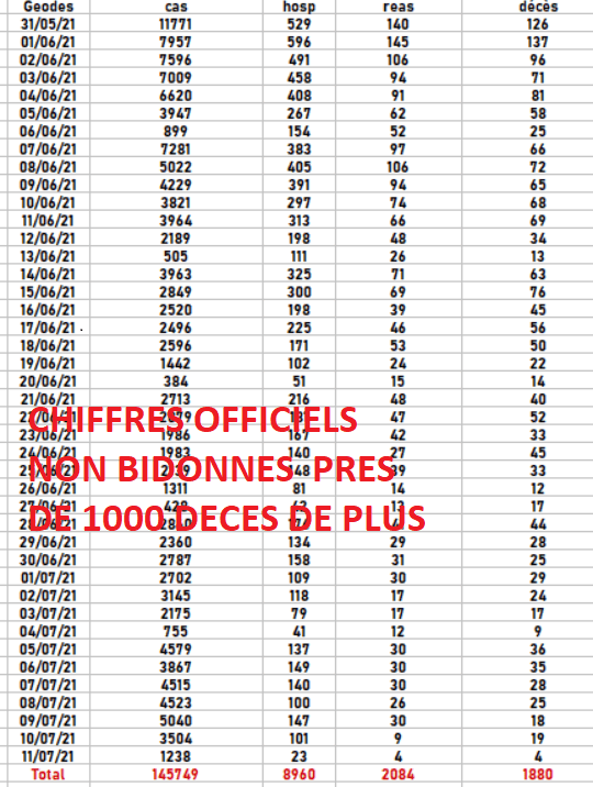 Les preuves de la magouille, le gouvernement communique 926 décès covid entre le 31 mai et le 11 juillet , il précise 720 non vaccinés, les chiffres officiels que l’on retrouve sur Geodes sont différents : il y a eu en réalité 1880 décès covid sur la même période. Pourquoi avoir triché et magouillé ?
