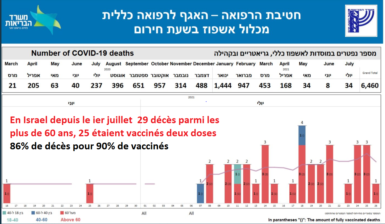 Du 10 aout au 8 septembre Israel a comptabilisé 667 décès dus au COVID-19 au cours de cette période, avec seulement 41,5% (277) dans le groupe non vacciné, 12,5% dans le groupe boosté troisième doses et 46,0% dans le groupe vacciné mais non boosté.