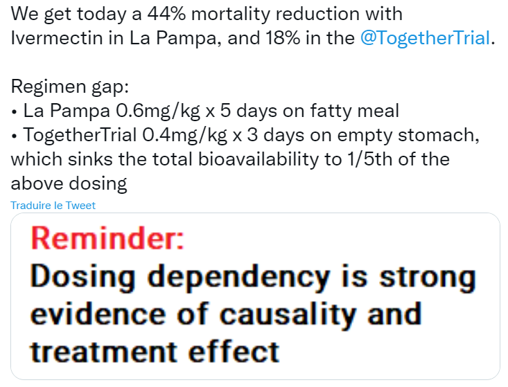 Ils ont tout essayé pour démontrer que l’ivermectine ne guérissait pas mais il ont du avouer qu’elle réduisait la mortalité de 18% ! L’expérience Together trial financée par Bill Gates ne pouvait nous faire le coup du surdosage mortel, avec l’ivermectine ,c’est impossible, restait le sous dosage. Face au variant bresilien particulièrement méchant les médecins qui soignent à l’ivermectine conseillent 0,5mg par jour et par kg pendant 5 jours. La bande à Gates a commencé a 0,2mg puis devant les protestations ils ont accepté 0,4 pendant trois jours. Malins ils ont fait prendre la molécule à jeun ce qui réduit son assimilation de 1/5