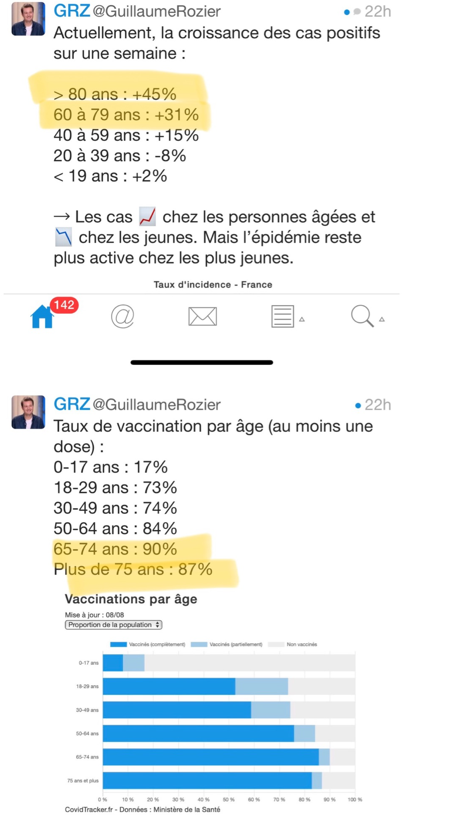 Une information surprenante lâchée sur twitter par le très macronien Guillaume Rozier, non communiquée aux médias mais très officielle : la contagion progresse chez les catégories vaccinées à plus de 90% et stagne chez les plus jeunes moins vaccinés tout en restant active.