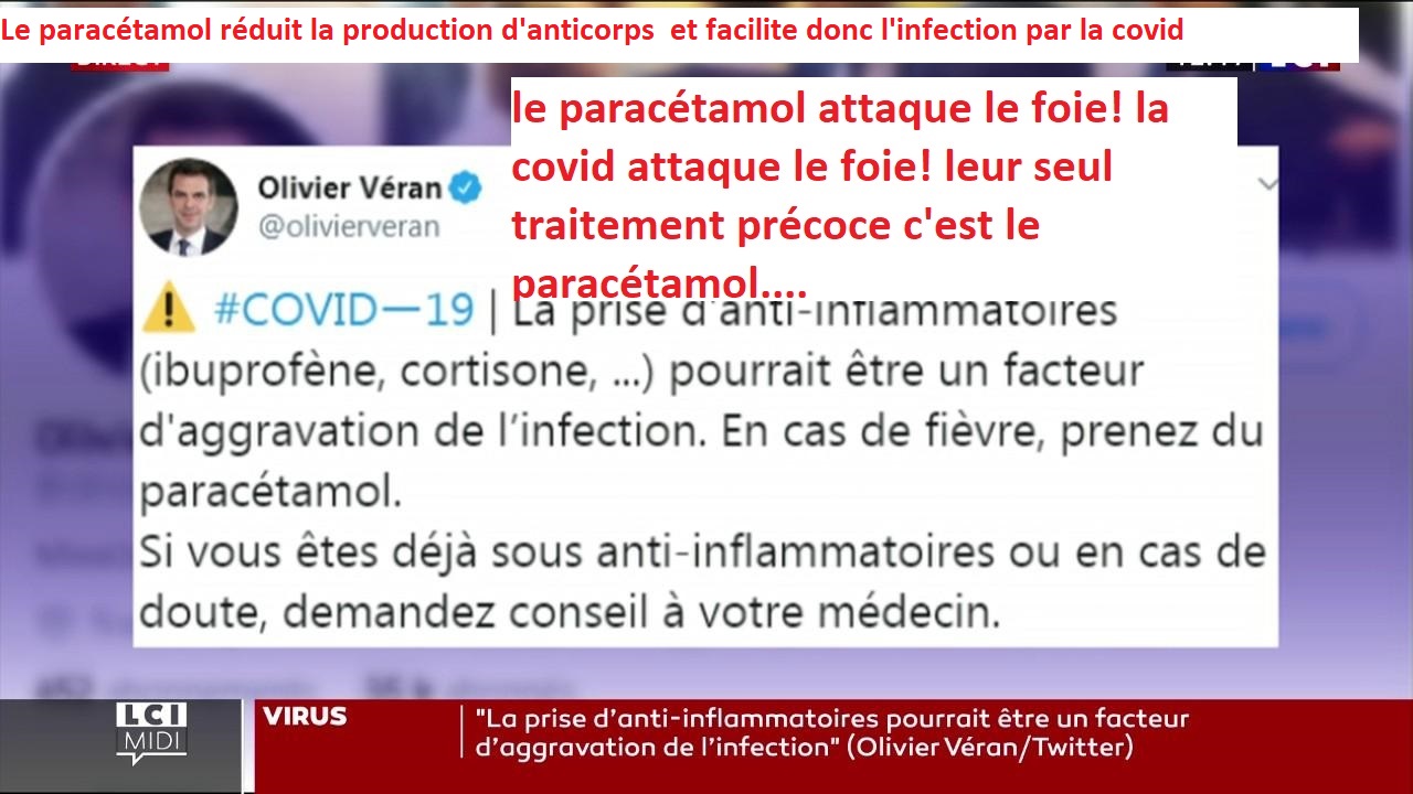 Veran a interdit l’aspirine et l’Ibuprophène  qui ont des actions anti inflammatoires . Il s’est trompé, toutes les études le disent depuis plusieurs mois. Pire , Veran s’est fait le supporter du paracétamol  avec une activité anti-inflammatoire et antiplaquettaire nulle  mais qui en plus entraine une forte baisse  du  glutathion (GSH) . Surtout pas de paracétamol en cas de covid ou si vous supportez mal la vaccination ….