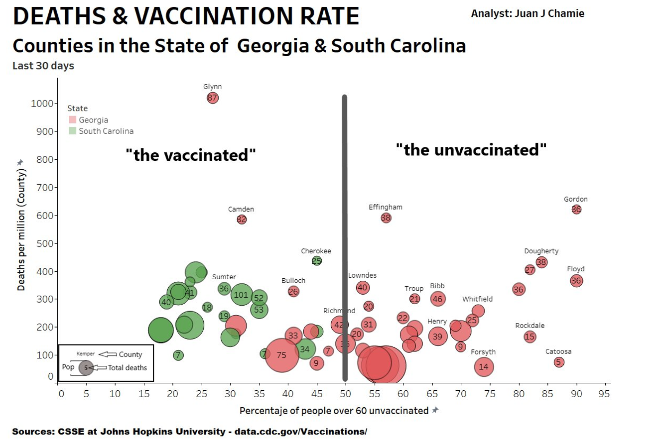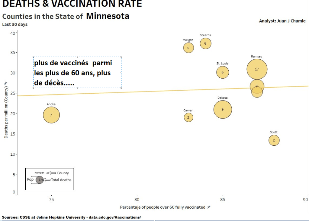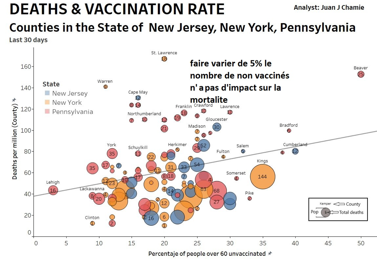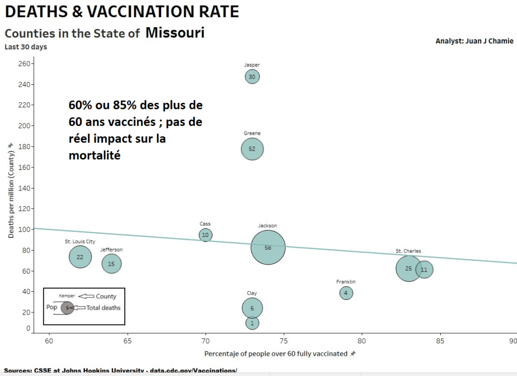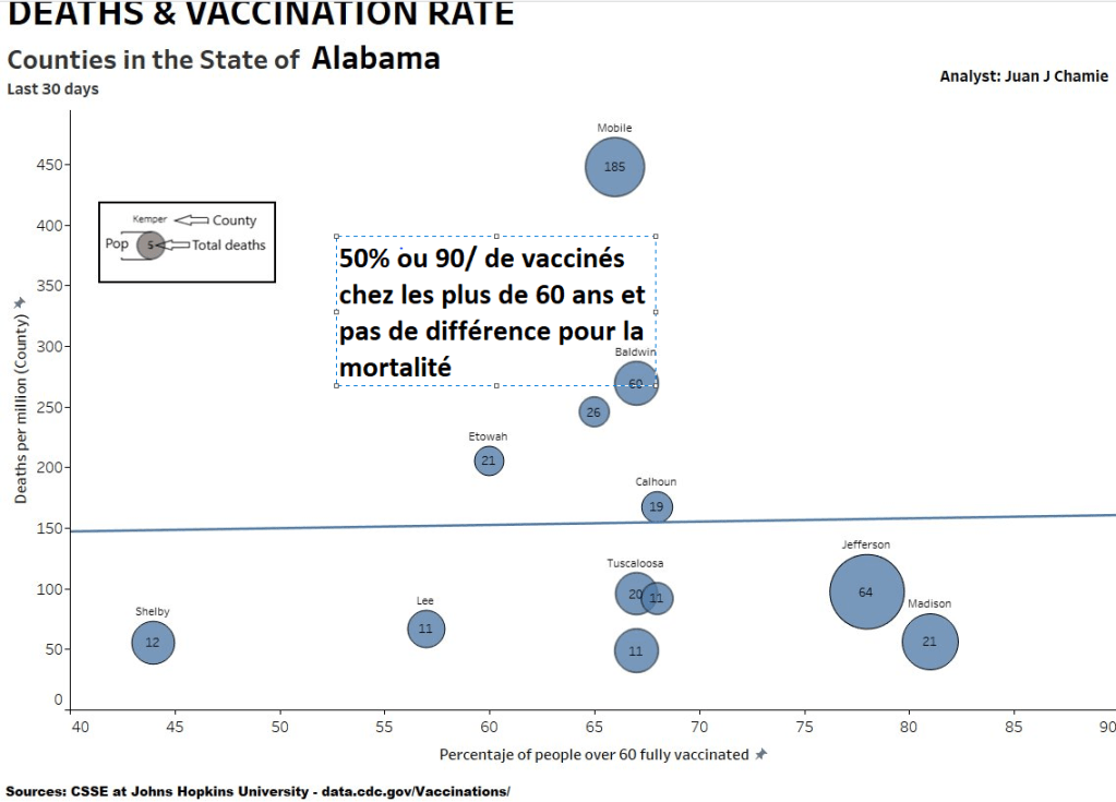 Juan Chamie est Senior Data Analyst at FLCCC à Cambridge (USA) il vient de publier une étude sur l’impact du pourcentage de vaccinés de plus de 60 ans sur le taux de mortalité covid. Il observe des centaines de comtés américains du même état ou d’état voisins avec donc des données structurelles comparables. Dans certains le pourcentage de vaccinés de plus de 60 ans est élevé, dans d’autre au même moment, il plus faible.