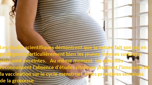 Les études scientifiques démontrent que la nature fait son job en protégeant particulièrement bien les jeunes femmes surtout si elles sont enceintes. Au même moment les autorités reconnaissent l’absence d’études cliniques prouvant l’innocuité de la vaccination sur le cycle menstruel et les premières semaines de la grossesse