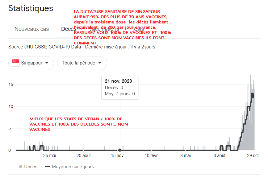 LA DICTATURE SANITAIRE DE SINGAPOUR  AURAIT 99% DES PLUS DE 70 ANS VACCINES, depuis la troisième dose  les décès flambent , l’équivalent  de 200 par jour en France. RASSUREZ VOUS 100% DE VACCINES ET  100% DES DECES SONT NON VACCINES ( le Monde) ILS FONT COMMENT ? Ils doivent importer leurs morts …