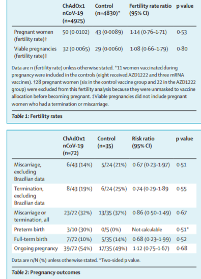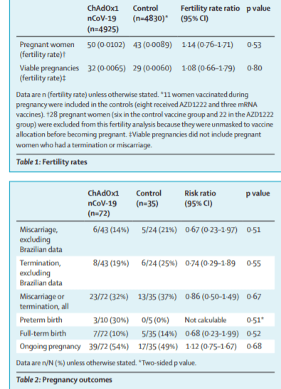 dans trois pays ( NCT04324606 et NCT04400838 au Royaume-Uni ; NCT04536051 au Brésil ; et NCT04444674 en Afrique du Sud). Les participantes en âge de procréer (définies comme 49 ans ou moins) ont été randomisées pour recevoir ChAdOx1 nCoV-19 ou le vaccin témoin. La grossesse était un critère d’exclusion dans les quatre essais, et toutes les femmes volontaires ont été testées négatives pour la -hCG urinaire avant la vaccination. Toutes les grossesses survenues après la vaccination ont été enregistrées et suivies jusqu’à 3 mois après la naissance. Les résultats de la grossesse ont été examinés par le comité indépendant de surveillance des données et de la sécurité.