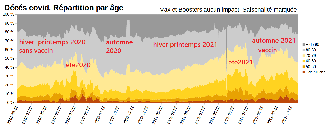 Au printemps 2021  les décédés sont massivement les plus âgés comme un an plutôt. Les vaccins n’ont pas encore eu le temps de faire effet direz-vous ? Oui mais à l’automne 2021 on retrouve la même structure, les décédés sont des vieux…Ah mais c’est parce qu’ils ne sont pas protégés par la troisième dose… Désespérant… Alors on vous assène « la preuve, cet été lors de la quatrième vague  la part  des vieux baisse , celle des jeunes augmente ! les vaccins sont efficaces… » .