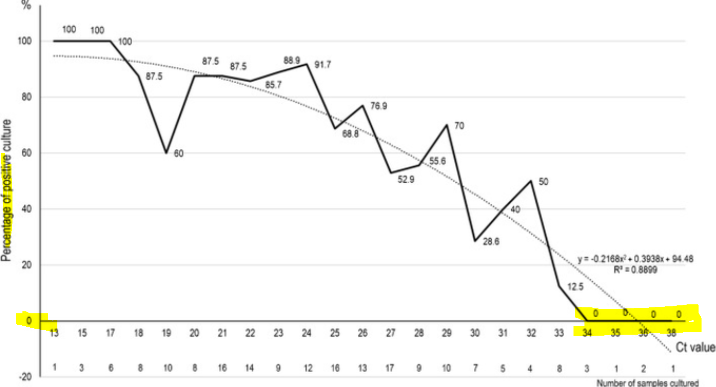 Plus récemment, des résultats similaires ont été rapportés par des chercheurs de l’Agence de santé publique anglaise dans un article paru le 13 août dans Eurosurveillance : « La probabilité de cultiver du virus chute à 8 % dans des échantillons pour lesquels le Ct est supérieur à 35.