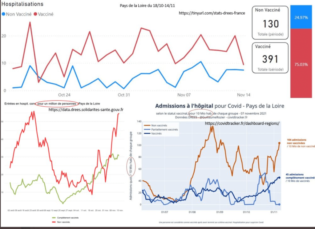 La drees fournit encore les chiffres bruts de cas pour les régions , ainsi 130 non vaccinés hospitalisés dans les pays de la Loire contre 391 non vaccinés , on calcule les pourcentages et on compare à la part de chaque groupe dans la population
