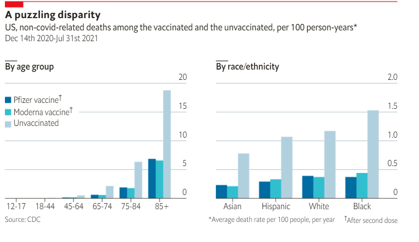 A minorer le nombre de décès parmi les vaccinés on en arrive à des chiffres absurdes . Ainsi aux Etats Unis le taux de mortalité des plus de 85 ans vaccinés serait quatre fois moins élevé que celui des non vacciné du même âge. Poussons l’analyse plus loin le taux de mortalité d’un asiatique de plus de 85 ans serait seize fois plus faible que celui d’un noir non vacciné….