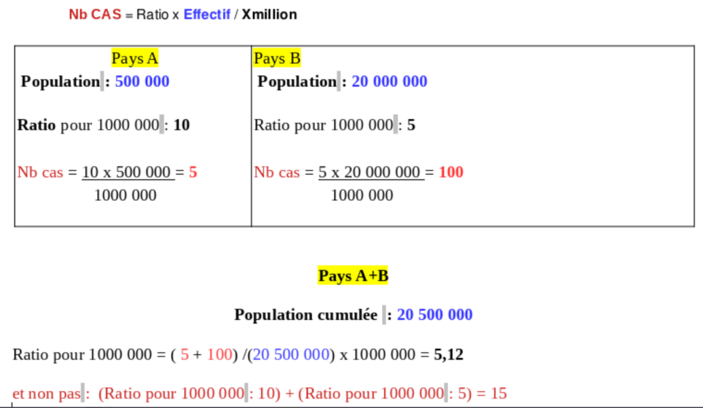 Dit autrement le ratio rapporté à la population dans un ensemble n’est pas égal au cumul des ratios rapportés aux sous-populations. Exemple :