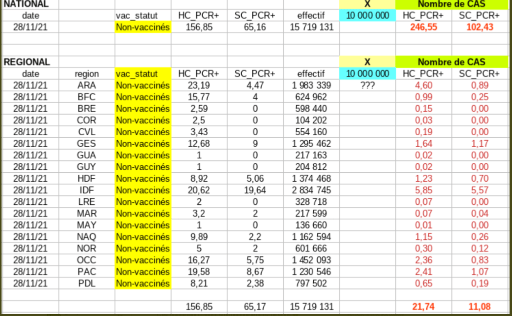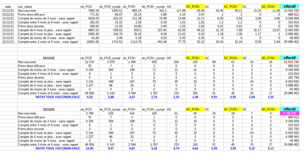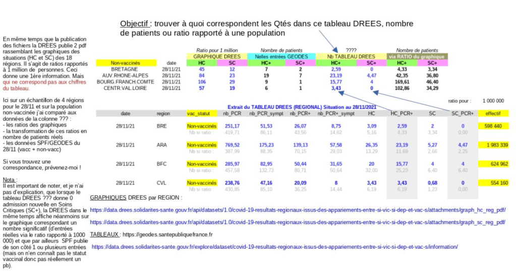 Les chiffres fournis par la Drees sont d’une confusion extrème . Impossible de trouver le nombre de cas bruts rapportés au nombre de vaccinés et de non vaccinés mais des décimales et des ratios qui changent sans arret. C’est bien un travail de pisteur pour approcher de la vérité.
