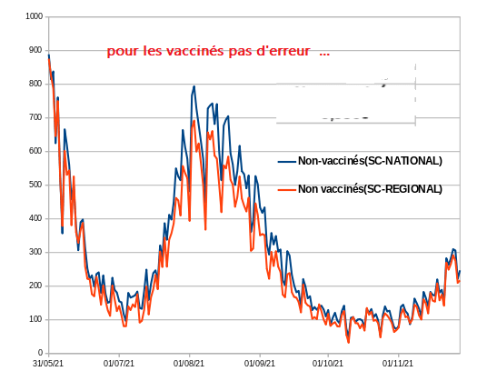 Après vérification, je n’ai pas retrouvé le différentiel de corrélation que vous indiquez entre les données régionales et nationales de la DREES pour les vaccinés.