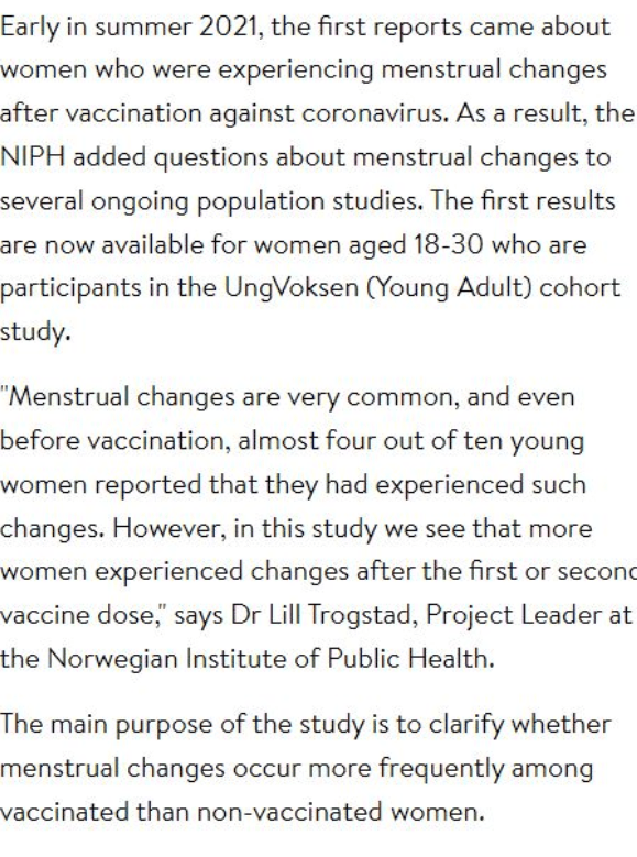 Norvège : Le FHI (Folkehelseinstituttet – Norwegian Institute of Public Health) – rapporte dans une étude que 4 femmes sur 10 entre 18 et 30 ans ont leurs menstruations perturbées après vaxx