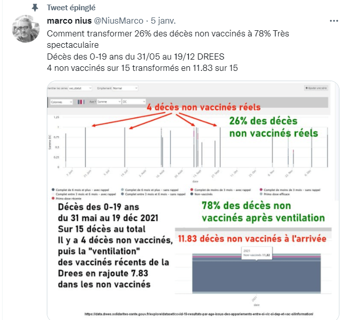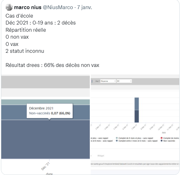 Marco Nius donne un exemple concret qu’il a trouvé sur le site de la Drees, les décès des moins de 20 ans en France . O non vacciné 0 vacciné après 15j 2 statuts « inconnus » qui seront attribués pour les 2/3 aux non vaccinés