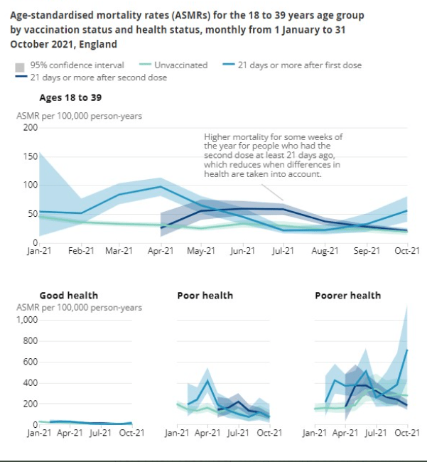 Les statistiques britanniques ci dessous portant sur la période du 1er janvier au 31 octobre 2021 font apparaitre une forte surmortalité pour les double doses ( bleu foncé) si on compare avec les non vaccinés . Pire les personnes en mauvaise santé ne sont pas protégées mais plus exposées