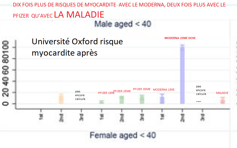 . Analyse du risque relatif de myocardite par des chercheurs d’Oxford qui ont publié un article dans Nature Medicine le 14 décembre. Les auteurs constatent des taux fois plus élevés de myocardite induite par le vaccin que de myocardite due à une infection chez les hommes de 16 à 39 ans.