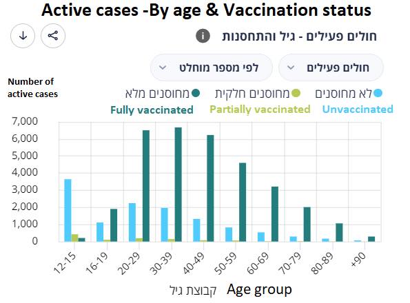 Si le graphique des « Active cases » en Israël est en nombre de cas et non en %, il est normal que ce nb soit plus élevé pour les vaccinés vu que ceux-ci représentent plus de 90% de la population. Il faudrait comparer en % pour que ce soit significatif.