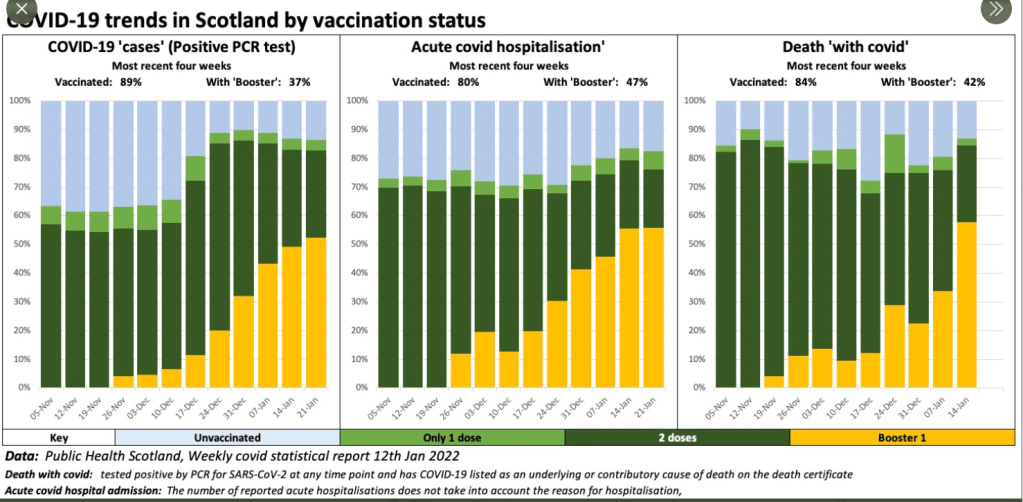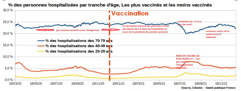 Regardons ces données officielles récupérées par Marco Nius. La vaccination ne fait pas baisser le % des plus âgés parmi les hospitalisés en période de pandémie , ils étaient pourtant vaccinés au printemps dernier . Les plus jeunes ont vu leur proportion d’hospitalisés augmenter non à cause du covid mais hors contagion, au moment de leur vaccination…