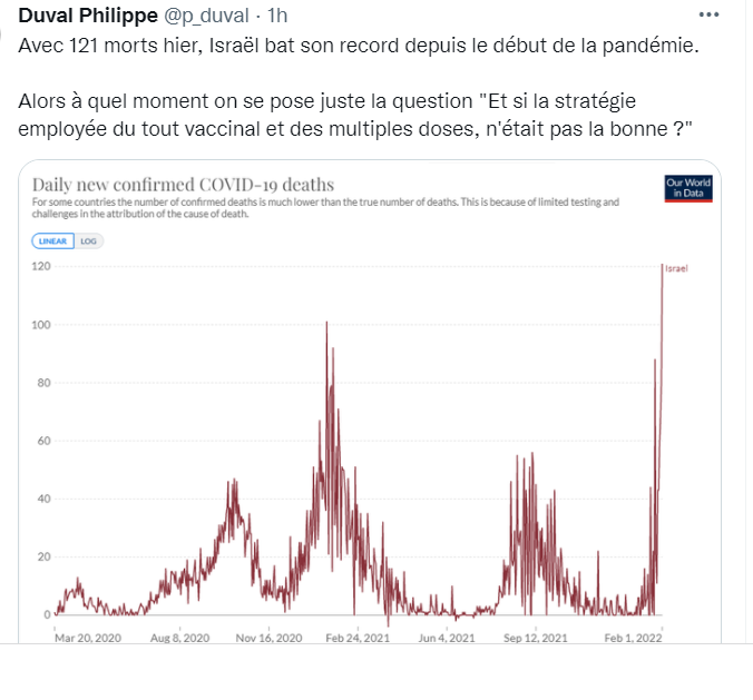 pro-science, anti-BS™@GabinJean3·2/2 L’interview mentionnée est ici (en hébreu). Le Prof.Y Jeris, est le Directeur du département COVID à l’hôpital Ichilov de Tel-Aviv. D’autres ont-ils contesté ses affirmations en Israël ? »Je crois qu’il veut dire que du moment où tu tombes malade ça ne change plus rien (d’être vax ou pas). Il a pris soin de dire à la fin qu’il fallait se faire vacciner » me dit quelqu’un qui parle Hébreu. L’article est donc conforme à ses déclarations, mais omet ce dernier point!