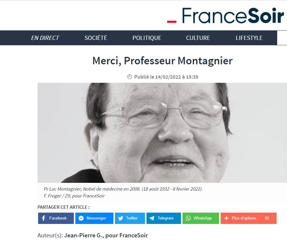 L’AFP, le 10/02/2022 à 19:35, s’est autorisée : « Le scientifique Luc Montagnier, prix Nobel pour la découverte dans les années 1980 du virus du sida, est mort à 89 ans, discrédité depuis longtemps par la communauté scientifique après avoir multiplié les affirmations dénuées de fondement, notamment contre les vaccins. Luc Montagnier accuse « le cartel » de l’industrie pharmaceutique de le prendre pour cible, car il est « l’homme qui fait peur ». »