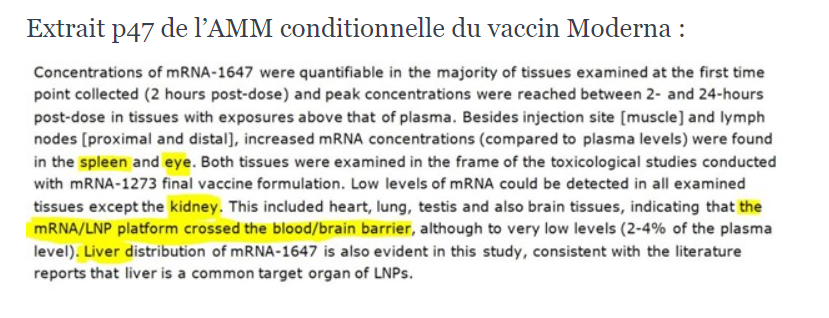 Les vaccins ARNm testés pour la première fois sur des animaux montrent que les nanoparticules d’ARNm ne restent pas localement au site de ponction dans le tissu musculaire, comme supposé et revendiqué par les fabricants, mais vont dans les organes à des concentrations parfois dramatiques, où ils sont transférés de cellules en cellules et absorbés en continu. »
