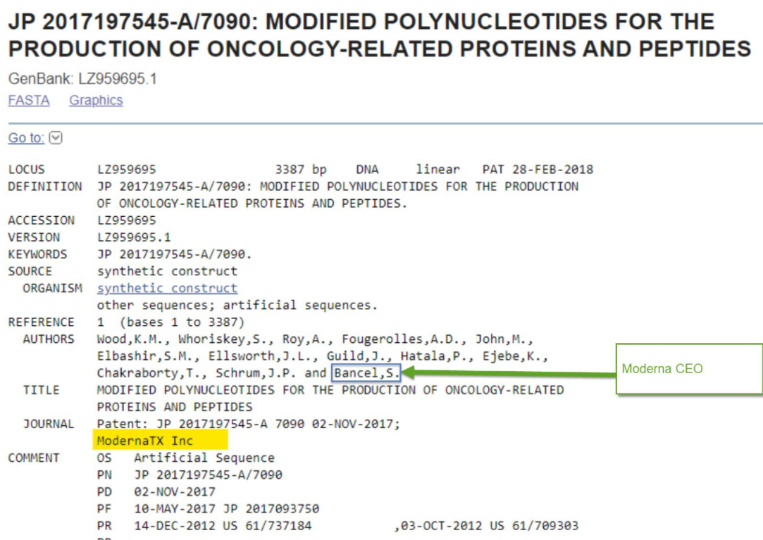 En 2018, le CEO de Moderna, Stéphane BANCEL, a breveté la séquence du gène modifié de SARS-CoV-2 Nous sommes en févier 2022, Stéphane décide de céder le reste de ses actions pour 400 millions $ et a supprimé ses comptes sur les médias sociaux