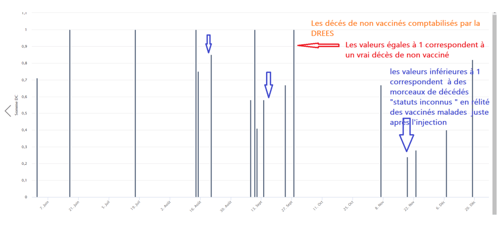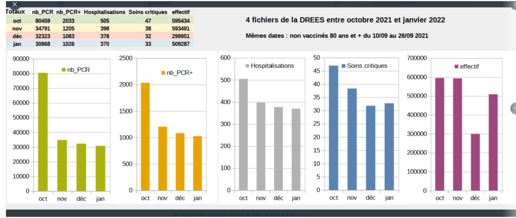 - La manipulation des données: regardez la situation des non vaccinés de plus de 80 ans du 10/09 au 26/09 2021 .Marco Nius a enregistré sur la Drees leur situation à 4 moments ( une fois par mois), et obtient…quatre fois des données différentes ! On les estime à 600 000 en octobre, 300 000 en décembre et 500 000 en janvier; Il s’agit pourtant du même groupe; les plus de 80 ans tels qu’ils étaient en septembre…