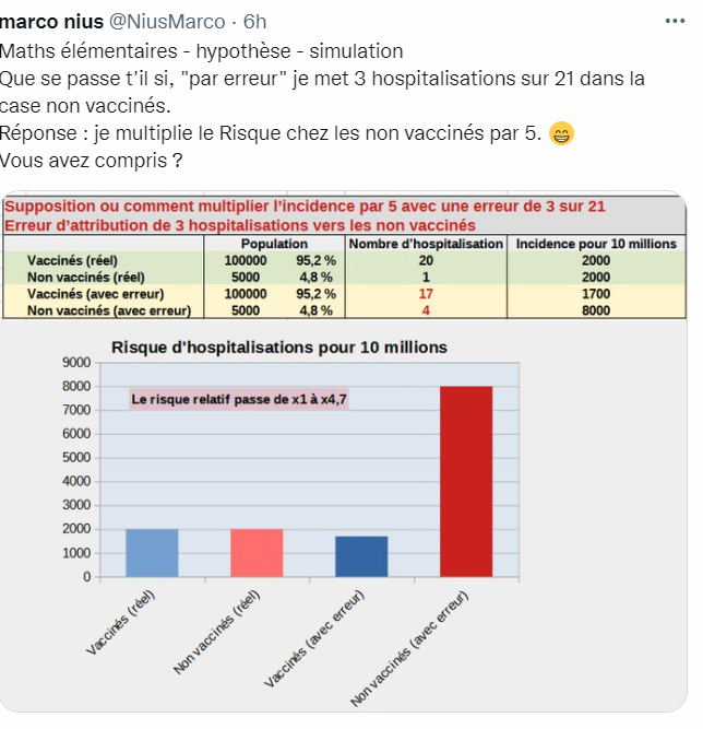 - La manipulation des données: regardez la situation des non vaccinés de plus de 80 ans du 10/09 au 26/09 2021 .Marco Nius a enregistré sur la Drees leur situation à 4 moments ( une fois par mois), et obtient…quatre fois des données différentes ! On les estime à 600 000 en octobre, 300 000 en décembre et 500 000 en janvier; Il s’agit pourtant du même groupe; les plus de 80 ans tels qu’ils étaient en septembre…