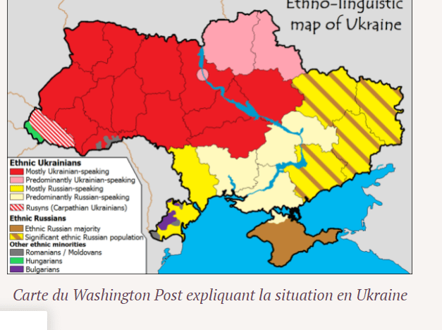 Bonjour, Hitler aussi raisonnait en terme de langues et de minorités. Ces cartes me rappellent d’autres déjà vues au lendemain de la 1ere guerre mondiale. La langue n’est pas tout et n’autorise pas les annexions. Les Ukrainiens ont bien le droit de se grouper, d’élire qui ils veulent et de dire m…à une Russie oppressive et dirigée par des autocrates depuis toujours et vivre leur vie.